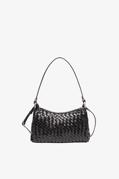 A small shoulder bag with a stylish woven design that is both practical and elegant. It features two detachable straps: a shorter one for shoulder or hand carry, and a longer adjustable strap for wearing cross-body. Both straps attach easily to the metal rings on the bag, allowing you to switch up your style effortlessly. Inside, there are three compartments, a zippered pocket, and an extra slot for small essentials.