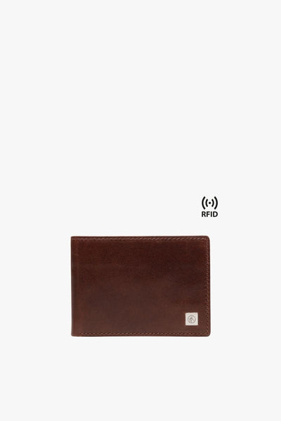 A compact wallet with space for cards and cash. It features a large bill compartment and eight card slots for simple and organized storage. RFID protection prevents unauthorized card scanning.