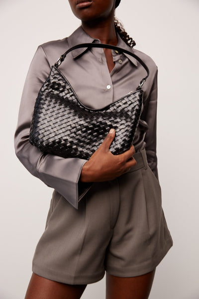 Elegante und geräumige Tasche aus gewebtem Leder mit zeitlosem Design. Sie verfügt über ein geräumiges Hauptfach mit Reißverschluss und kleinere Innentaschen für optimale Organisation. Die Mona wird mit zwei abnehmbaren Riemen geliefert: einem Schulterriemen und einem verstellbaren Riemen, der quer über den Körper getragen werden kann. Beide Riemen lassen sich einfach an den Metallringen der Tasche befestigen, sodass Sie Ihren Stil mühelos verändern können.